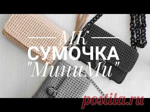 На изображении представлены три вязаные сумочки, расположенные на светлом фоне. Они различаются по цвету и некоторым деталям, включая цепочку в качестве ремешка у черной сумочки и разные замки. Текст на изображении гласит: "МК — сумочка "Мишель" posilka.ru", что предполагает мастер-класс по созданию вязаных сумочек, вероятно, с сайта posilka.ru.