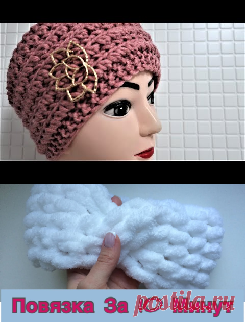 Верхняя часть изображения показывает манекен с розовой вязаной шапкой, украшенной золотистой брошью в форме цветка. Нижняя часть содержит руку, держащую белую пушистую вязаную вещь, похожую на шарф или снуд. Внизу надпись на русском языке "Повязка за postila.ru".