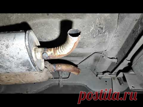 На изображении показана нижняя часть автомобиля, включая выхлопную систему с глушителем и выхлопной трубой.