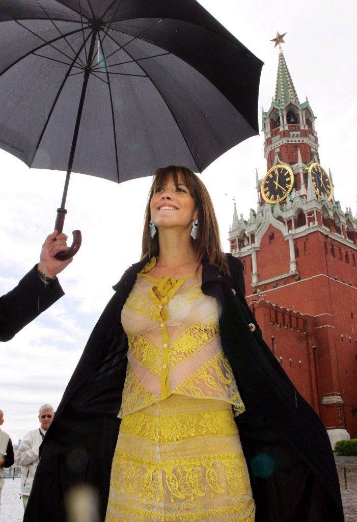 Женщина с улыбкой на лице под зонтом на фоне Спасской башни Кремля в Москве. Она одета в нарядное желтое платье и черное пальто