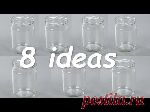 На изображении восемь прозрачных стеклянных банок расположены на светлом фоне с текстом "8 идей" над ними и веб-ссылкой "postilla.ru" внизу.