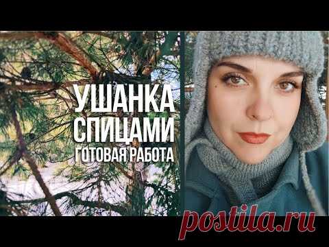 На изображении представлена женщина с косметикой на лице, одетая в теплую зимнюю одежду, вроде шапки и шарфа, на фоне природы, вероятно, это промо-фото для ушанки, созданной спицами. Слово "готовая работа" указывает на то, что это рекламное изображение готового изделия, и, возможно, предложение о покупке.