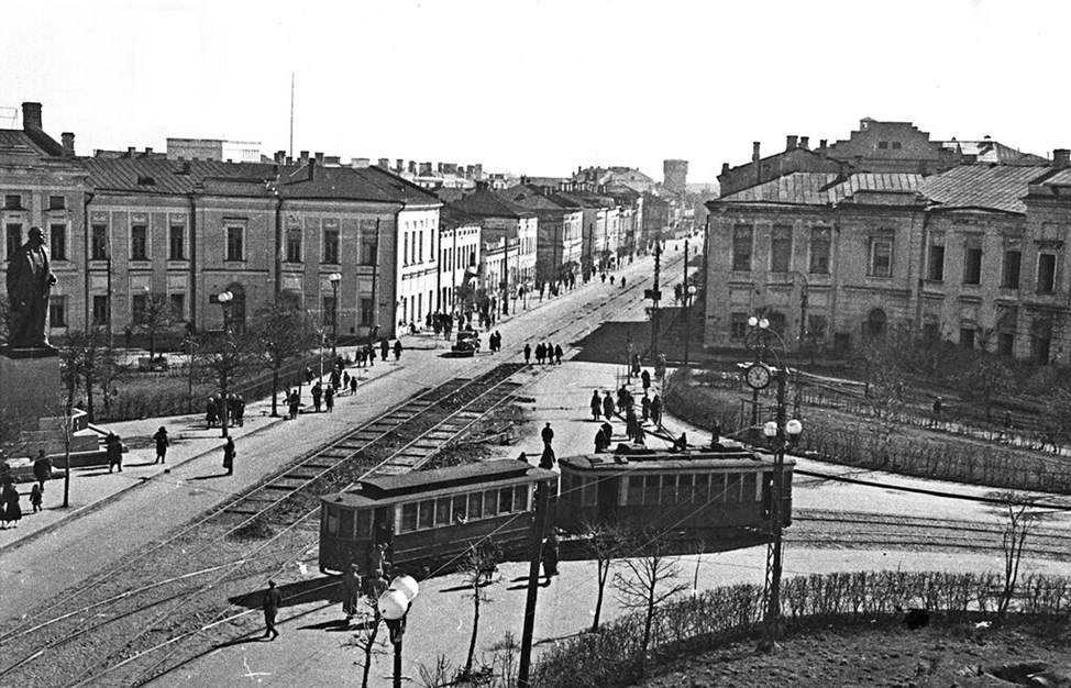 Историческая фотография городского пейзажа с трамваем, людьми, и зданиями, вероятно сделана в начале 20-го века
