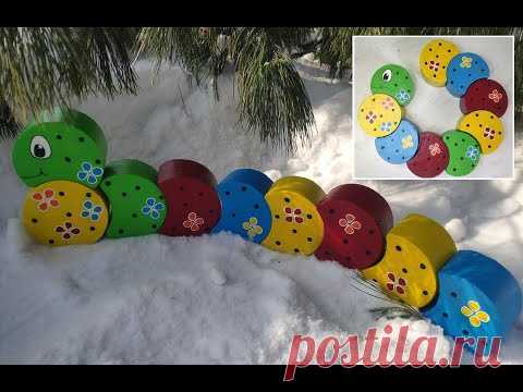 Цветная гусеница сделанная из деревянных кружков на фоне снега под ветками ели.
