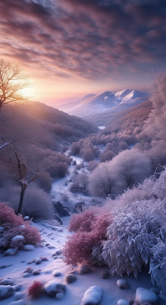 Красивый зимний пейзаж при закате. Снежные холмы и деревья покрыты инеем, а на заднем плане виднеются горы и подсвеченное закатом небо с облаками.