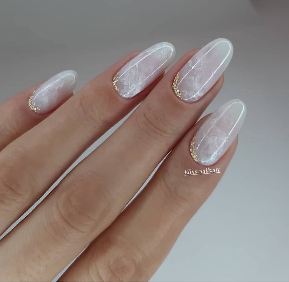 Изображение демонстрирует руку с маникюром. Ногти длинные, овальной формы, с белым мраморным дизайном и золотыми акцентами у основания ногтей.
