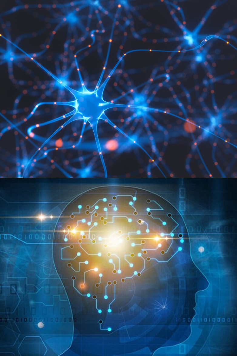На изображении изображены визуальные концепции, связанные с нейронными сетями и искусственным интеллектом. Верхняя часть изображает нейронную сеть с точками и связями, имитирующими структуру мозга, в то время как нижняя часть показывает силуэт головы человека с внутренним контуром в виде электронной платы, символизирующий технологию искусственного интеллекта.