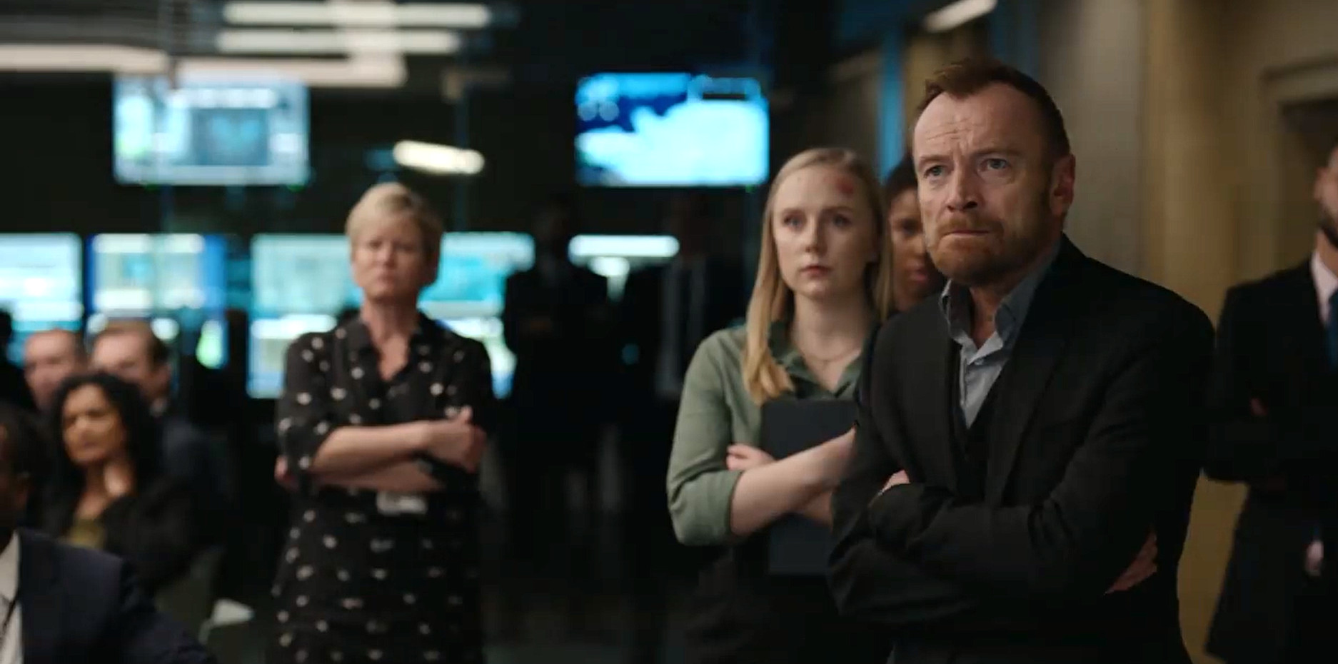 Группа людей в бизнес-одежде выглядит внимательно и сконцентрированно в одном направлении, предположительно следя за происходящим событием или презентацией.
