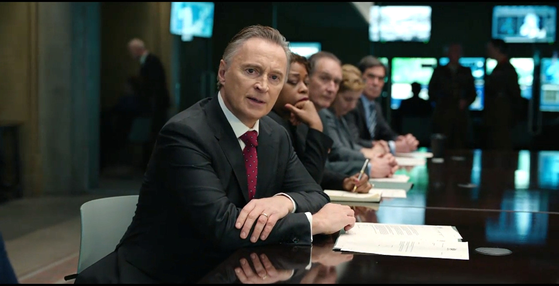 Мужчина в костюме сидит за столом в конференц-зале, обращая внимание на камеру, окружен другими людьми в деловой обстановке.