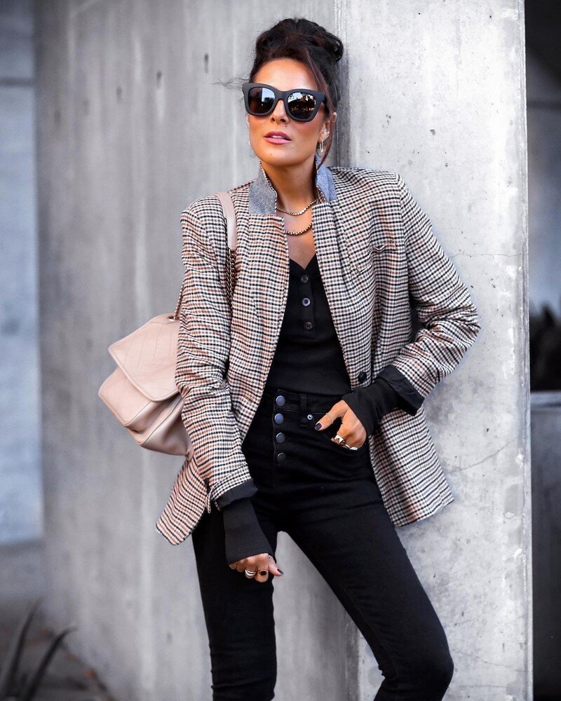На фото изображена женщина, облокотившаяся о стену. Она одета в модный наряд, включающий пиджак в клетку, черные брюки и темную блузку. На женщине также солнцезащитные очки, и она держит светлую сумку на плече.