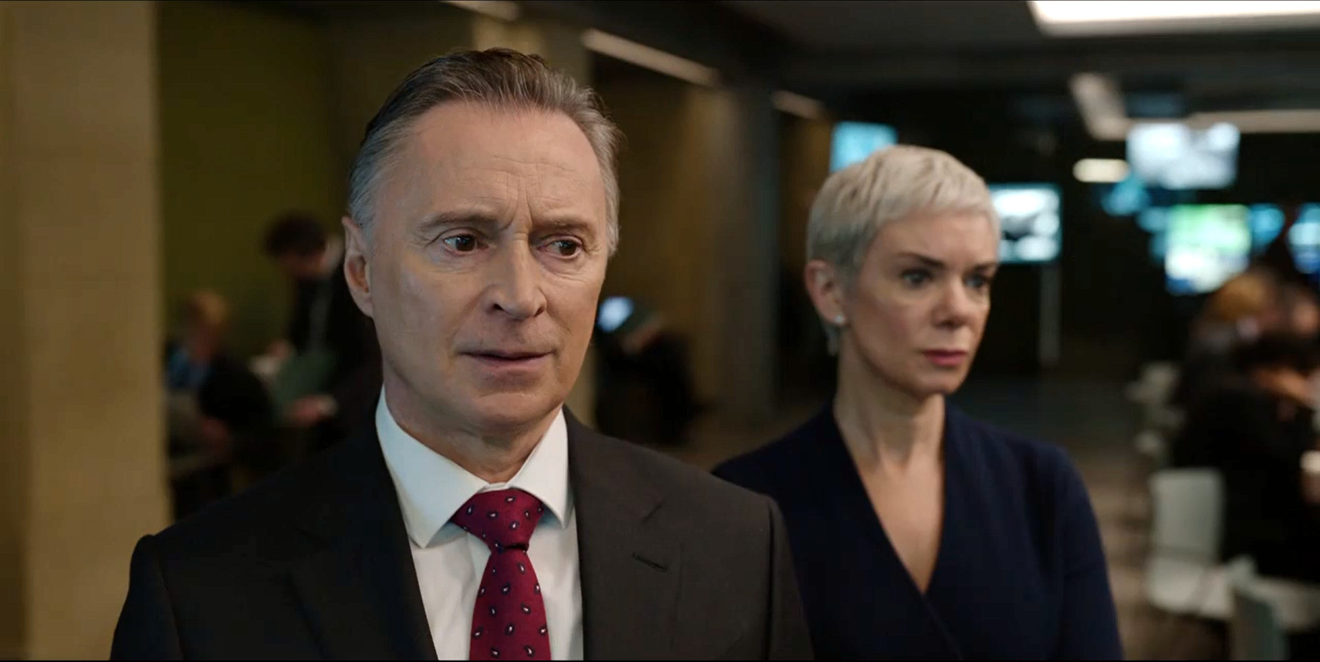 На изображении видны два человека в деловой одежде. Мужчина впереди носит костюм и галстук, выглядит серьезным. Женщина позади имеет короткие светлые волосы и также одета в деловой стиль. Они находятся внутри здания, возможно, в коридоре или лобби.