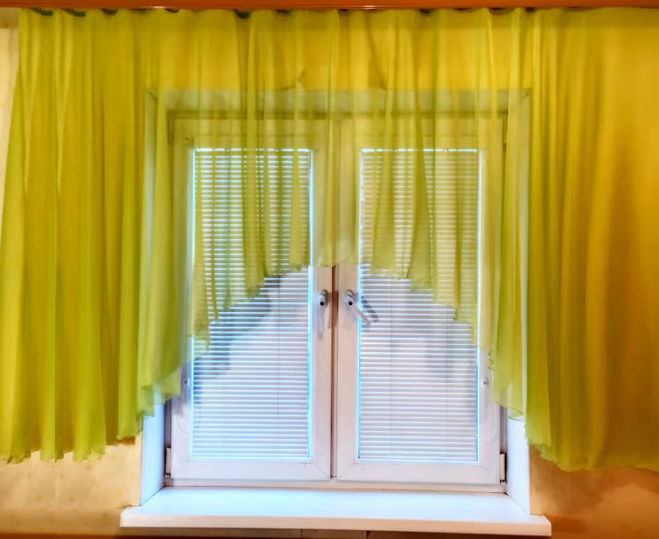 На изображении представлено окно дома с белыми жалюзи. Окно украшено зелёными шторами, которые придают уютный и светлый вид. Верхняя часть окна скрыта зелёным куском материала с надписью "postila.ru", что может указывать на водяной знак или лого.
