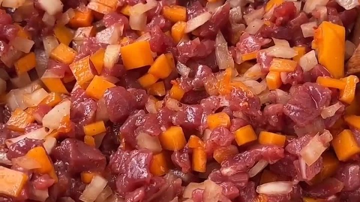 Нарезанные ингредиенты, вероятно, для приготовления блюда: кубики мяса, моркови и лука.