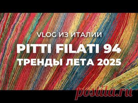 На изображении представлен скриншот с видео, на котором виден текст: "VLOG из Италии PITTI FILATI 94 тренды лета 2025", на фоне цветных нитей. Возможно, это анонс модного влога, связанного с итальянской выставкой текстильной промышленности.