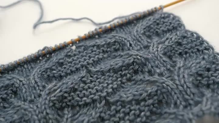 На изображении показан процесс вязания: серая вязаная ткань с узором и спицы с навитой шерстяной пряжей.