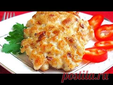 На изображении представлено блюдо, которое выглядит как запеченное мясо или курица под золотистой сырной корочкой, поданное с листом зелени и дольками помидора.