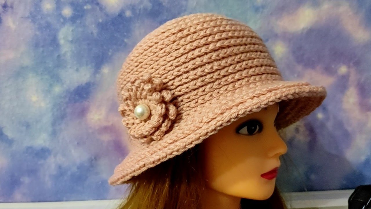 На манекене представлена розовая вязаная шляпа с декоративным цветком и жемчужной бусиной на передней стороне. Фон размытый, с имитацией космического или небесного пространства.