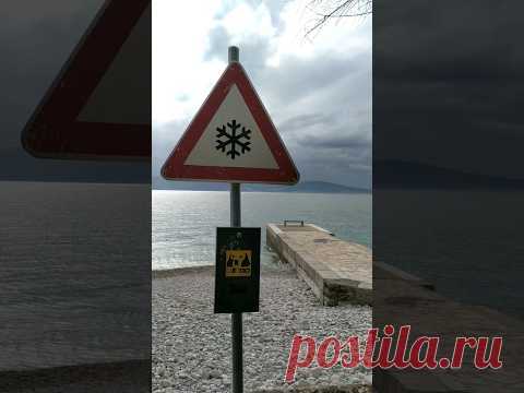 На изображении виден дорожный знак предупреждения о возможном гололеде, установленный на фоне морского побережья и тучного неба. Также присутствует указатель с символикой, предупреждающий о пешеходной зоне на берегу.
