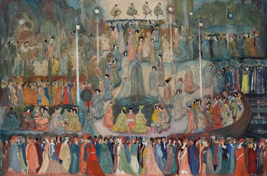 Изображение представляет собой картину в наивном стиле. На картине множество людей в ярких, цветастых нарядах, танцующих и разговаривающих вокруг водоёма или фонтана. На заднем плане видны театральные декорации и фигуры, которые подвешены к потолку или находятся на высоте, создавая впечатление парящих в воздухе. Освещение добавляет волшебства и праздничной атмосферы к зрелищу.