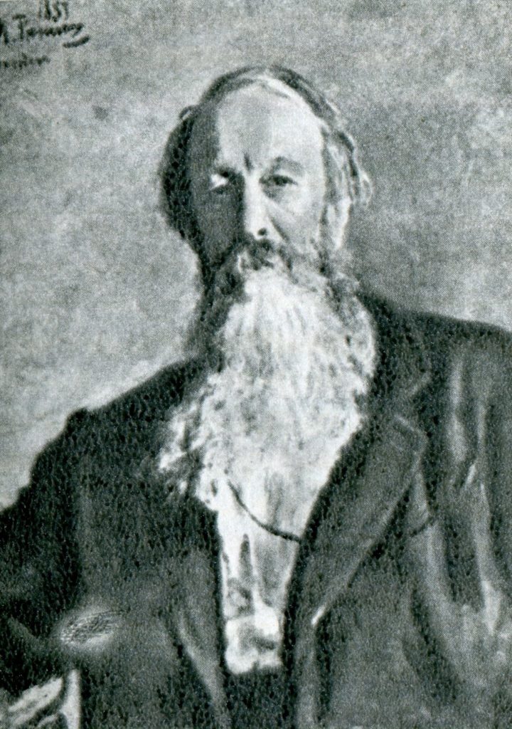 На изображении представлен портрет мужчины с бородой. Он одет в темный пиджак и взгляд у него обращен прямо на зрителя. Портрет выполнен в монохромной палитре, скорее всего, это художественное полотно или репродукция старинного портрета.