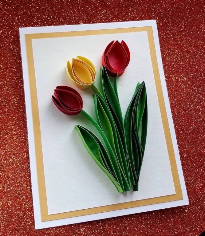 Открытка с трёхмерным изображением тюльпанов, сделанным в технике квиллинга. На открытке изображены три тюльпана разного цвета - красного, желтого и бордового - на белом фоне с золотистой и коричневой обрамляющими полосами.