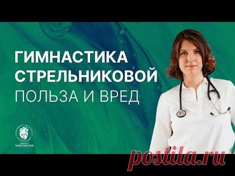 На изображении представлена женщина в белом медицинском халате с фонендоскопом на шее. Она кажется профессиональным медицинским работником. В углу изображения есть текст на русском языке: "Гимнастика Стрельниковой Польза и вред" и внизу виден URL "posila.ru". Фон изображения - зеленый с медицинскими символами.