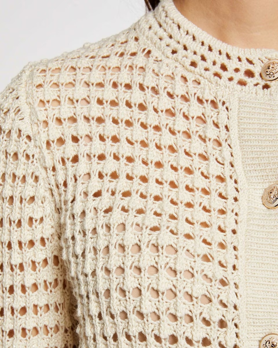 Крупный план вязаного кремового свитера с узором и пуговицей на плече.
