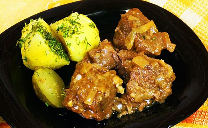 На изображении подано блюдо, состоящее из кусочков тушёного мяса в соусе с отварными картофелями, посыпанные укропом. Это нарезано и подано в чёрной тарелке на фоне жёлтой скатерти.