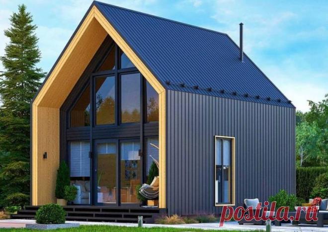 Современный дом с панорамными окнами и широким входом. Фасад дома сочетает темные и светлые оттенки, а дизайн выделяется угловатой конструкцией крыши и стен. Рядом с домом видна аккуратно подстриженная лужайка и небольшие кустарники.
