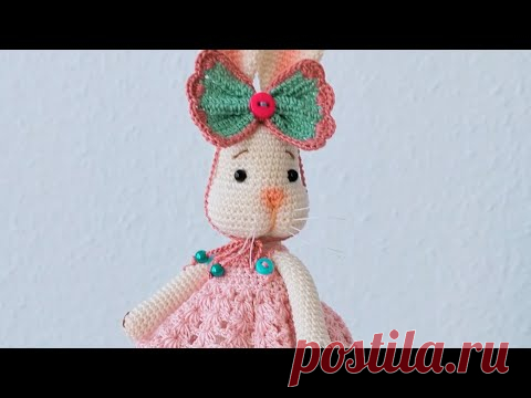 Вязаная кукла-зайка в розовом платье с зеленым бантом и пуговицами