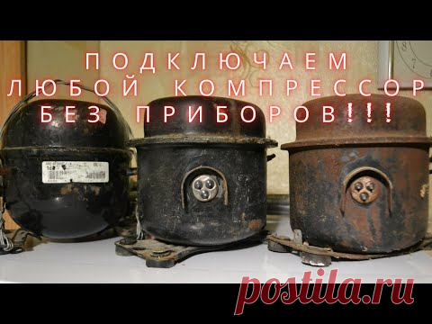 На изображении представлены три компрессора различного состояния и внешнего вида, на бирках видны надписи на русском языке. Текст на изображении гласит: "Подключаем любой компрессор без приборов!!!". Фон довольно нейтральный, предположительно это мастерская или склад.