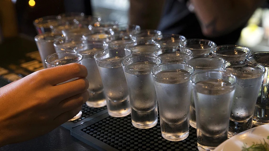 На фотографии изображены стопки с прозрачной жидкостью, вероятно, это алкогольный напиток, например, водка. Стопки стоят на барной стойке, и кажется, что кто-то собирается их взять или уже берет одну из них.