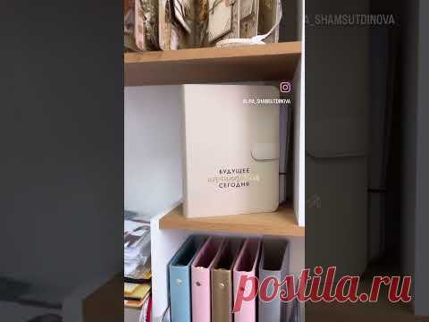 На изображении представлена полка с канцелярскими принадлежностями. Видны папки для бумаг, которые разложены в порядке и стоят рядом с коробкой, имеющей надпись. Обстановка напоминает офис или домашний рабочий уголок.