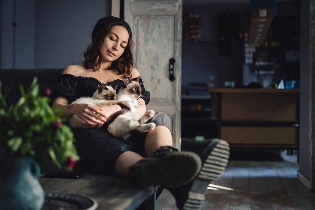 Женщина сидит и держит собаку в комфортабельной домашней обстановке. Она одета в стильную одежду и выглядит расслабленной.