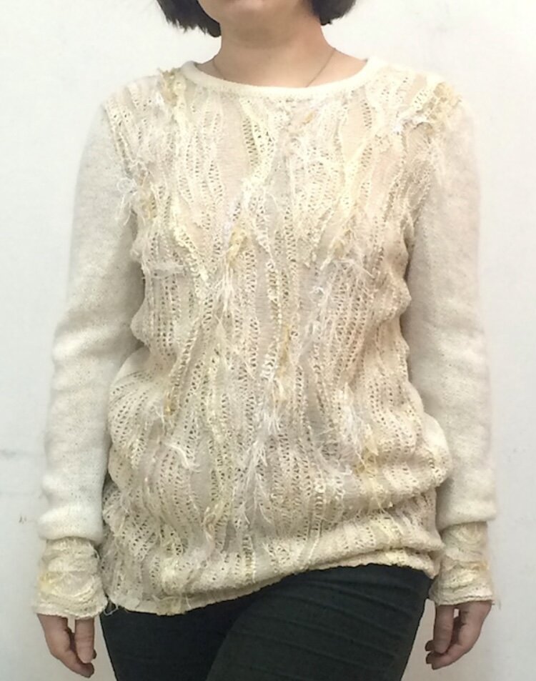 На изображении женщина в светлом вязаном свитере с узором. Свитер длинный, с длинными рукавами и текстурным дизайном. Женщина стоит на фоне светлой стены, и она носит темные брюки.