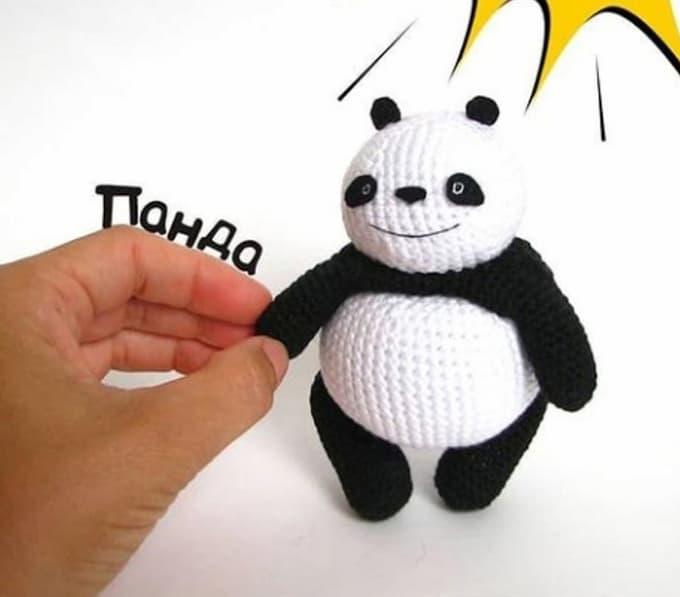 На изображении в руке человека игрушка в виде панды, выполненная крючком. Игрушка черно-белого цвета и симпатичного дизайна. На фоне видны росписи и слово "Панда", написанное по-русски.