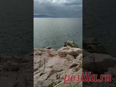 Изображение показывает скалистый берег с видом на море под пасмурным небом. На переднем плане видны красные скалы, а на горизонте заметны контуры гор.