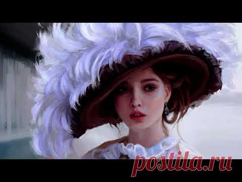 На изображении представлена женщина с романтическим образом, у которой на голове большая шляпа с пышными белыми перьями. У неё изящные черты лица, нежный взгляд и она одета в приподнятый винтажный стиль.