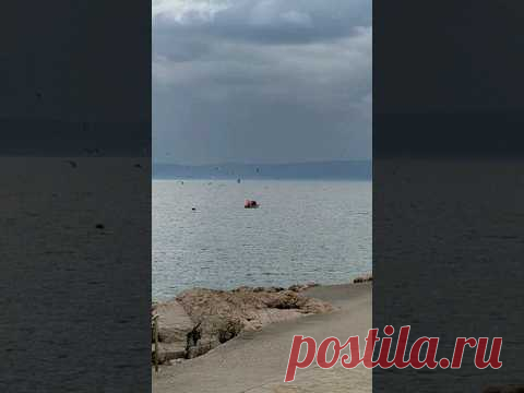 Вид на водную поверхность с берега. Облака освещены солнцем, которое пробивается сквозь них, создавая контрастный свет и тень на поверхности воды. На воде виднеются несколько небольших лодок и плавсредств. В центре изображения красное плавсредство привлекает внимание. Небо занимает верхнюю часть кадра, а водная гладь — большую его часть.