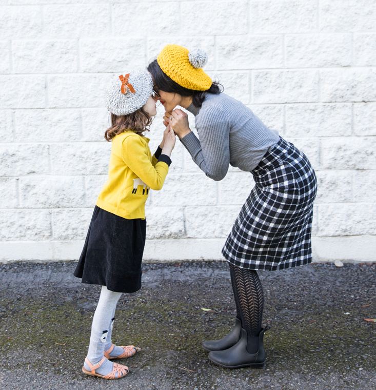 На фотографии изображена женщина и девочка, которые целуются в нос, стоя перед белой стеной. Обе находятся на улице и носят теплые шапки.