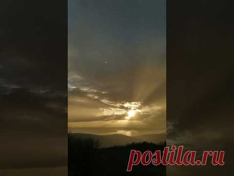 Изображение показывает заход солнца с проникающими сквозь облака лучами света. Небо окрашено в тёмные тона, создавая контраст с яркими оттенками заката. На заднем плане видны очертания горизонта.
