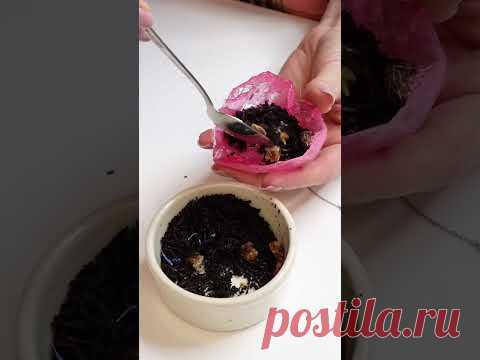 На изображении человек пересаживает растение. Кажется, они используют питомник или временную емкость в виде розового горшка и переносят растение в белый пластиковый горшок с помощью ложки. Земля видна как в исходной емкости, так и на ложке.