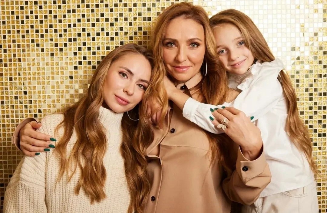 Три женщины улыбаются и объятиях друг друга перед фоном золотистой мозаичной стены. Они выглядят счастливыми и, возможно, являются членами одной семьи или близкими друзьями. У всех троих длинные волосы, и они одеты в повседневную одежду.