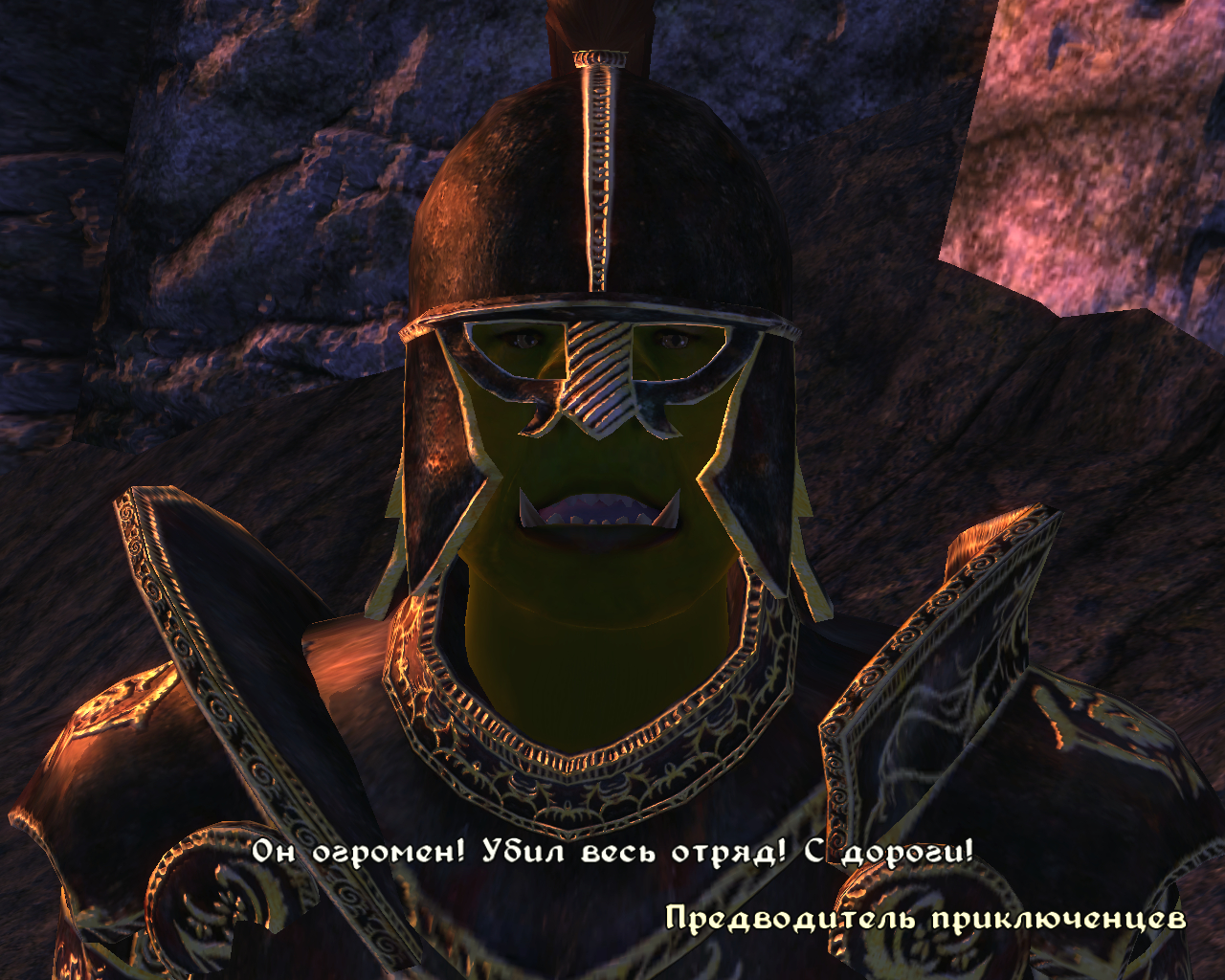 Предводитель приключенцев (Orc Adventurer Captain), пытавшихся одолеть Стража Врат. Сейчас он сломя голову несется к порталу в Сиродил, где бесследно и исчезнет. Orc Adventurer Captain who tried to defeat the Gatekeeper. Now he is rushing headlong towards the portal to Cyrodiil, where he will disappear without a trace.