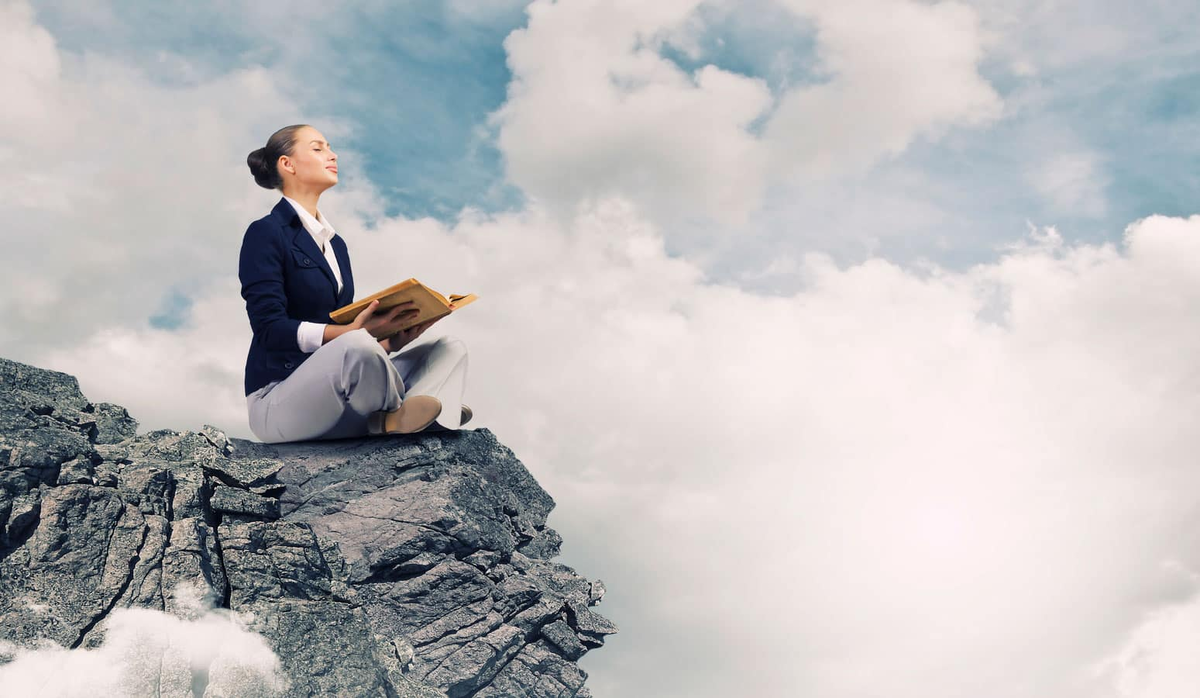Женщина в деловом костюме медитирует на вершине скалы с книгой на фоне облачного неба.