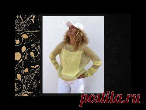 На изображении женщина в белой кепке и желтом свитере позирует, опираясь на бёдра и слегка наклонив голову назад. Рядом виден участок с узором, возможно, часть картины или декоративного элемента. Женщина улыбается и выглядит расслабленной. Она стоит на фоне, который визуально разделен на две части: справа белый фон, слева темный с золотистым узором.