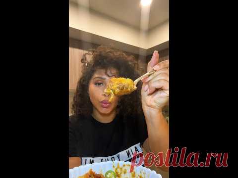 Женщина с кудрявыми волосами, едящая еду с вилки, смотрит на камеру. Она носит футболку с надписью. Перед ней на столе видна тарелка с едой.