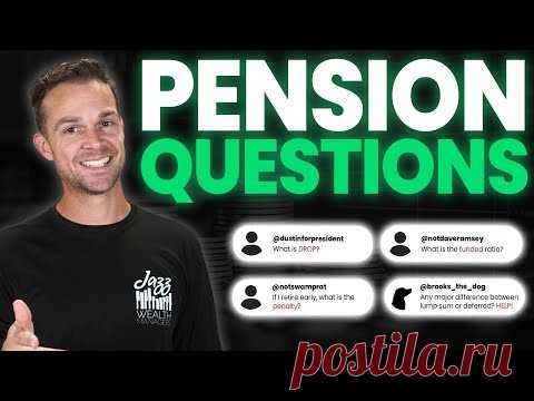 На изображении представлен мужчина в черной футболке, который улыбается и жестикулирует рукой. В фоне на зеленом фоне черным цветом написано "PENSION QUESTIONS". Вокруг текста размещены различные пользовательские комментарии и вопросы, связанные с пенсиями. Нижняя часть изображения содержит url: postila.ru.