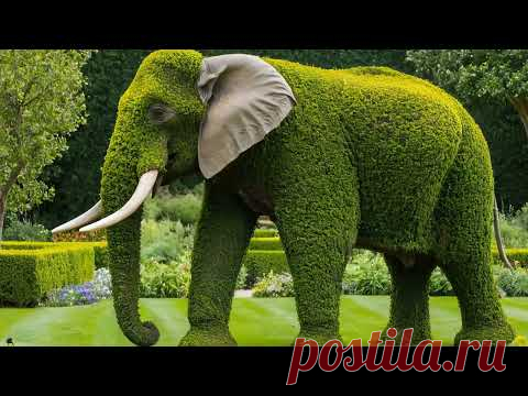 Скульптура слона, выполненная из живых растений, находится в зеленом саду