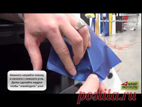 На изображении человек обучается технике наклеивания виниловой пленки на угол поверхности. Он аккуратно прижимает пленку к краю с помощью специального скребка для обеспечения плавности и отсутствия пузырей.